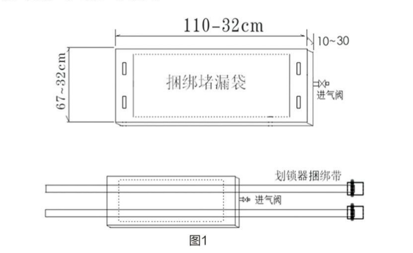 應(yīng)用在金屬、塑料、玻璃鋼材質(zhì)的各類管道、罐車、容器罐的砂眼、焊縫等腐蝕穿孔跑、冒、滴、漏類泄漏,或人為損壞的泄漏,包扎鎖緊后充氣堵漏應(yīng)急之用。(見圖1)